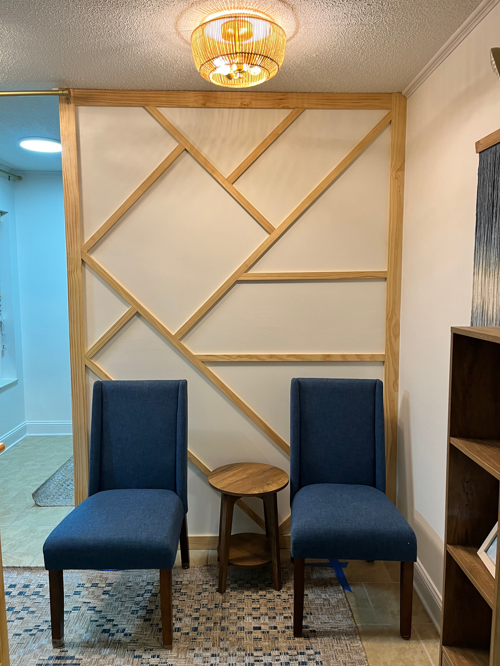 In October of 2024, we were enlisted to help Tidal Therapy Solutions out of Holly Ridge, NC bring their new office space to life. As pictured below, you will see that we created a few pieces for them. First and foremost is the façade we crafted for their desk. The façade we created was to ensure that their desk matched the theme of the rest of the office. The second thing we created was an abstract wall, meant to add a "wow!" factor to the space. We also crafted an AC unit cover, as there will be children in this space and we want to keep them safe. And finally, we added some of our signature shelves to a storage spot to tie everything together. We are so grateful for the opportunity to help the Tidal team bring their space to life, and we are so glad they love it as much as we do!