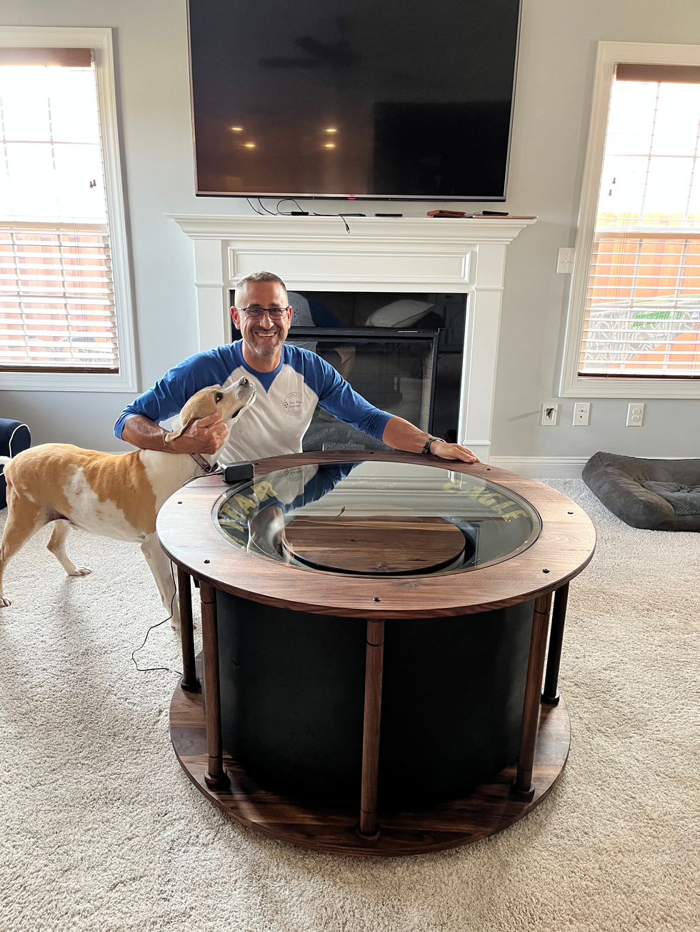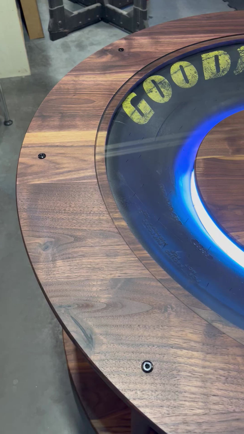 We are so incredibly excited to finally share this coffee table with everyone. A client approached us with a signed tire and was looking for it to be incorporated into a bespoke piece of furniture, and we were more than happy to accept the challenge. This table is made from 100% solid walnut, with a glass insert in the center. We added some LED light strips to really make it one-of-a-kind. In the words of our client, "it's everything I hoped for, but somehow better". We thoroughly enjoyed this project, from the design process to finishing it up with Walrus Oil products.