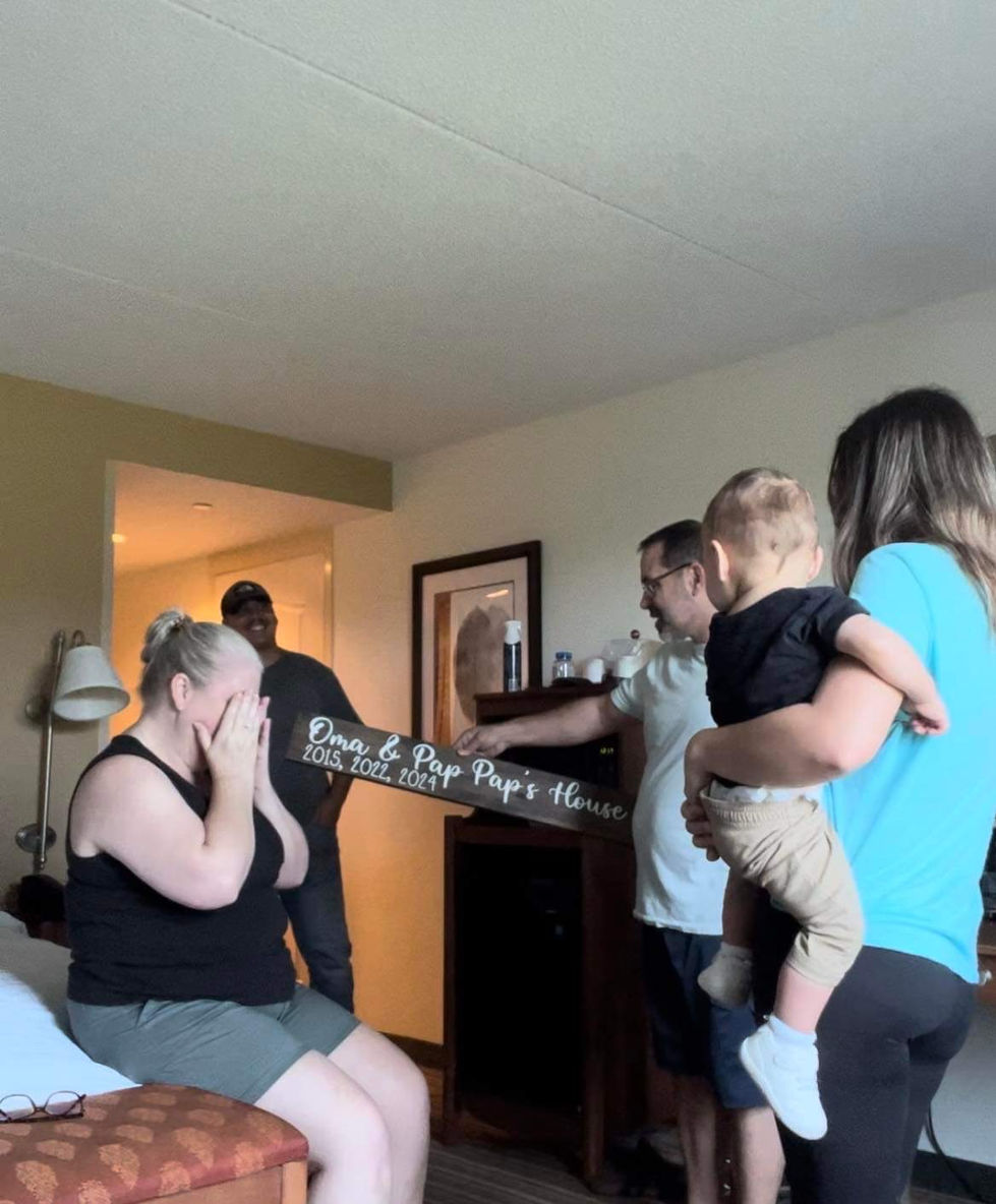 This sign is made from sturdy poplar wood and stained a dark walnut color. It's simple, yet beautiful. The lettering is hand painted, and the design was picked out by the client. We had to include pictures of "Oma and Pap Paps" reactions because it's too awesome not to share!
